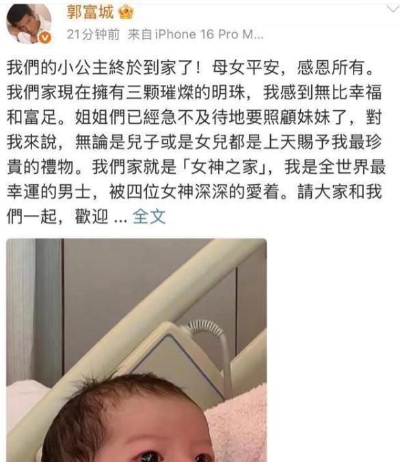 1日,郭富城在个人社交账号上公布了一个好消息,他的第三个小宝宝出生了,是个女儿,母女平安。他写了一段很温暖的话,他说:“现在家里有了三颗璀璨的明珠,他感到无比幸福和富足,他还特别提到,自己的家是“女神之家”,说自己是全世界最幸运的男士,被四位女神深深地爱”。