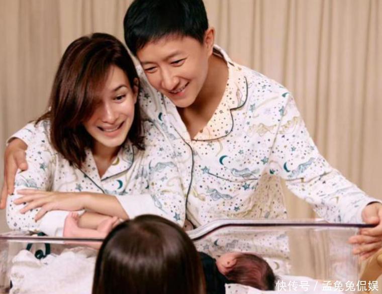 照片里,夫妻俩穿着同款睡衣,满脸笑意地看着新生儿,大女儿好奇地凑近看着刚出生的弟弟,画面十分有爱。